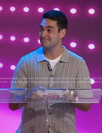 on Today on NBC was spotted wearing this grey cable knit short sleeve cardigan on Today on Aug 14 2024's episode. 's Sweater is the Short-sleeve Cotton Cable-knit Polo Cardigan Sweater in Hthr Taupe by J. Crew.