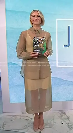 on Today on NBC was spotted wearing this beige sheer shirt and skirt on Today on Aug 14 2024's episode. 's Top is the Peri Silk-Blend Chiffon Shirt in Neutral by The Frankie Shop . 's Skirt is the Peri Silk-Blend Chiffon Midi Skirt in Neutral by The Frankie Shop . 's Earrings is the Fin Earrings by Bottega Veneta.