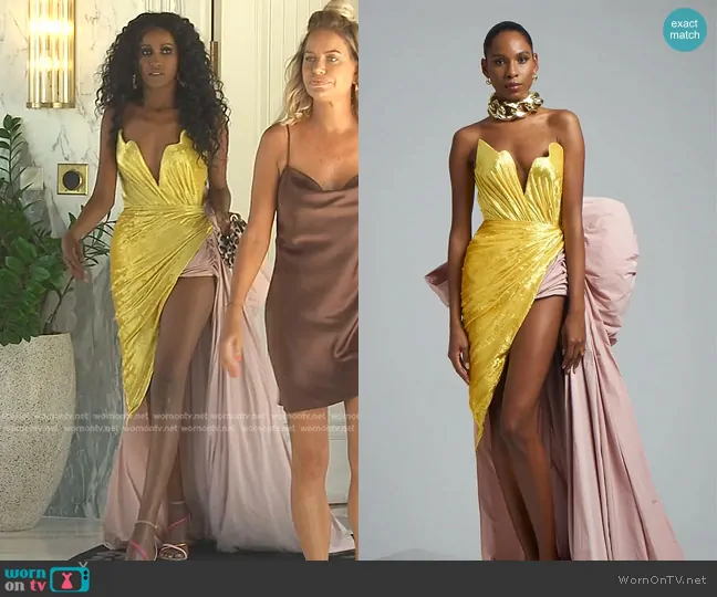 Chanel Ayan (played by Chanel Ayan) on The Real Housewives of Dubai on BravoTV was spotted wearing this gold and pink asymmetric dress on The Real Housewives of Dubai on episode 'Dressed to the Whines' (2x10) in Aug 2024. Chanel's Dress is the Yellow Plunge Dress with Blush Pink Trail LM2022R5 by Laith Almalouf . Chanel's Earrings is the Logo Lettering Hoop Earrings by Moschino . Chanel's Shoes is the Pink First Sculpted Heel Slingback Sandals by Fendi.