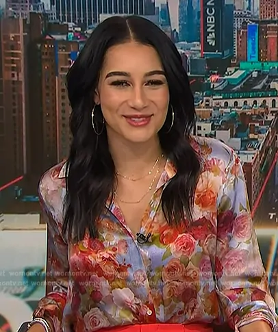 Morgan Radford on NBC News Daily on NBC was spotted wearing this floral print blouse and red pants on NBC News Daily on Aug 14 2024's episode. Morgan's Top is the Tyler Silk Shirt in Pink Multi Soft Cloud Floral by L'Agence . Morgan's Pants is the Dylan High-Waisted Wide-Leg Pants by Alice + Olivia.