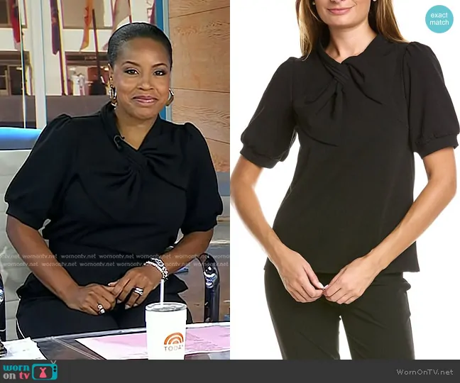 Sheinelle Jones on Today on NBC was spotted wearing this black bow neck top on Today on Aug 15 2024's episode. Sheinelle's Top is the Bow Neck Blouse by Gracia.