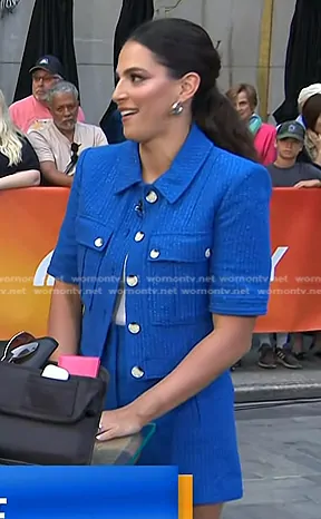 on Today on NBC was spotted wearing this blue short sleeve tweed jacket and shorts on Today on Aug 15 2024's episode. 's Jacket is the Rosalina Short Sleeve Cotton Blend Tweed Jacket in Cobalt by Veronica Beard . 's Shorts is the Jazmin Cotton-Blend Tweed High-Waist Shorts in Cobalt by Veronica Beard.