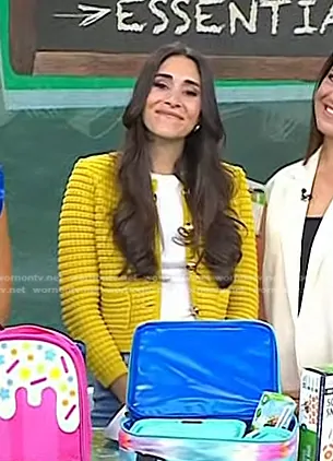 on Today on NBC was spotted wearing this yellow cardigan on Today on Aug 15 2024's episode. 's Sweater is the Gaspard Crewneck Cardigan Sweater by Ba&sh.