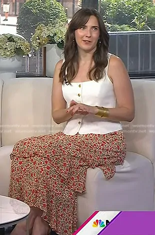 on Today on NBC was spotted wearing this white sleeveless top and floral skirt on Today on Aug 15 2024's episode. 's Top is the Scoopneck Vest in drapey crepe by J. Crew . 's Skirt is the Preslee Tiered Midi Skirt in Ditsy Trail Cream by Rixo.