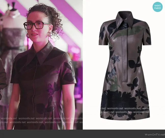 (played by ) on Emily in Paris on Netflix was spotted wearing this Assistants leather floral print shirtdress on Emily in Paris on episode 'Love on the Run' (4x02) in Aug 2024. 's Dress is the Abraham Flower Patchwork Lambskin Leather Dress by Akris.