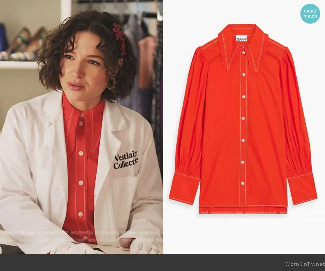 (played by ) on Emily in Paris on Netflix was spotted wearing this employee on episode 'Break Point' (4x01) in Aug 2024. 's Top is the Ruffle-trimmed cotton-poplin shirt by Ganni.