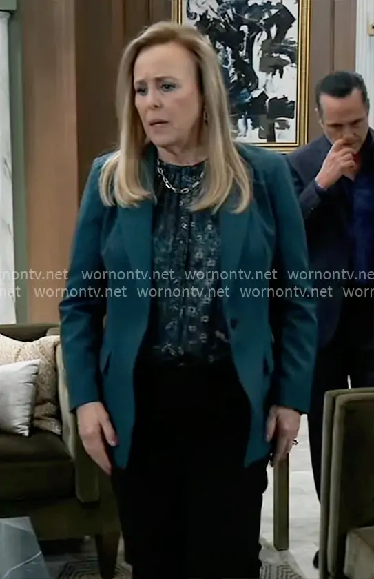 Laura Collins (played by Genie Francis) on General Hospital on ABC was spotted wearing this green printed blouse and green blazer on General Hospital on Dec 28 2025's episode. Laura's Top is the Shai Blouse in Sea Moss by Kobi Halperin . Laura's Jacket is the Jordi Jacket in Sea Moss by Kobi Halperin .