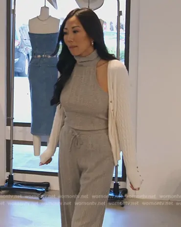 Katie Ginella on The Real Housewives of Orange County on Bravo was spotted wearing this gray knit halter top and pants on The Real Housewives of Orange County on episode 'All Up in Gina's Grill' (18x06) in Aug 2024. Katie's Top is the Textured Halter Top by Zara . Katie's Pants is the Textured Wide Leg Pants by Zara.