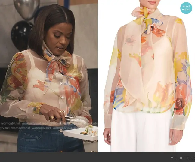 Vivian Banks (played by Cassandra Freeman) on Bel-Air on Peacock was spotted wearing this floral sheer tie neck blouse on Bel-Air on episode 'Baby, I'm Back' (3x01) in Aug 2024. Viv's Top is the Maryn Floral Organza Tieneck Top by Staud . Viv's Bag is the Togo Birkin 30 Gold by Hermes.