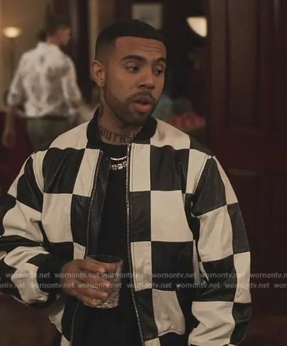 Quentin (played by Vic Mensa) on Bel-Air on Peacock was spotted wearing this checkerboard print jacket on Bel-Air on episode 'Pivot' (3x02) in Aug 2024. 's Jacket is the Milan Patchwork Leather Jacket by J Lindeberg.
