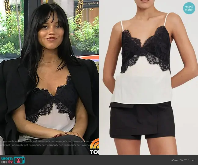 on Today on NBC was spotted wearing this black and white lace trim cami on Today on Aug 19 2024's episode. 's Top is the Lace Trim Silk Camisole in Philo by Rebecca Minkoff . 's Shoes is the Uma Slingback Pumps by Le Silla.