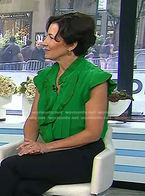 on Today on NBC was spotted wearing this green ruffle top on Today on Aug 19 2024's episode. 's Top is the Symons Sleeveless Blouse in Emerald Green Silk by The Fold.