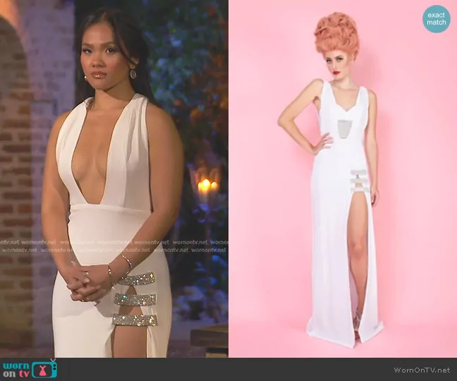 Jenn Tran on The Bachelorette on ABC was spotted wearing this white plunge halter neck gown on The Bachelorette on episode 'Week 7' (21x07) in Aug 2024. Jenn's Dress is the Selene Dress by Randi Rahm . Jenn's Jacket is the Capri Fur Trimmed Cashmere Shawl by Sofia Cashmere . Jenn's Shoes is the Ankle Strap Heeled Sandal by Jessica Simpson.