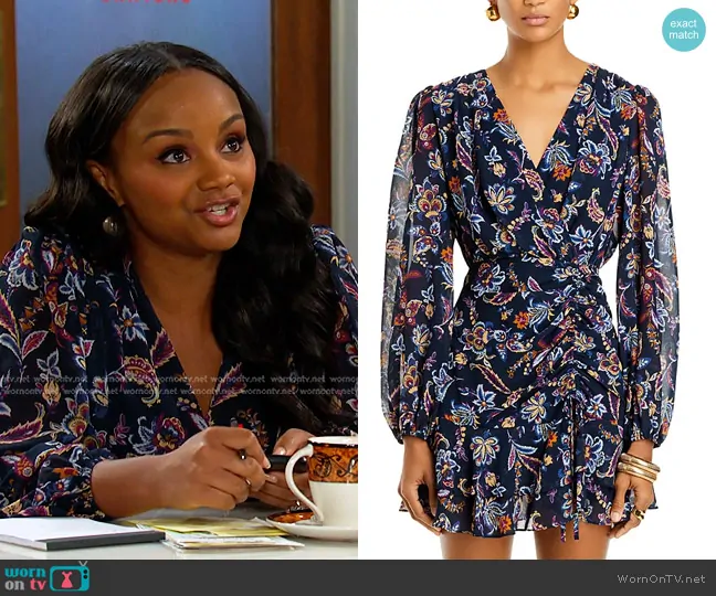 Chanel Dupree (played by Raven Bowens) on Days of our Lives on Peacock was spotted wearing this navy floral dress on Days of our Lives on Aug 20 2024's episode. Chanel's Dress is the Ruched Tiered Dress by Aqua . Chanel's Bag is the Sparkly Quilted Crossbody Bag by Zara.