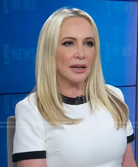 on E! News on E! was spotted wearing this white contrast trim dress on E! News on Aug 20 2024's episode. 's Dress is the Ringer Crewneck Shift Minidress by Theory.