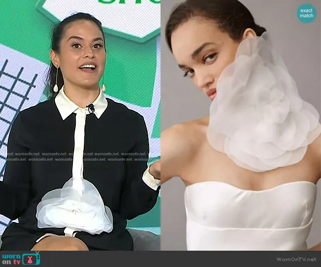 Donna Farizan on Today on NBC was spotted wearing this white floral organza belt on Today on Aug 21 2024's episode. Donna's Belt is the Organza Floral Multi-Purpose Band by Cynthia Rowley.