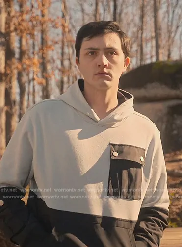 Demetri Alexopoulos (played by Gianni Decenzo) on Cobra Kai on Netflix was spotted wearing this colorblock front pocket hoodie on Cobra Kai on episode 'Underdogs' (6x04) in Jul 2024. 's Sweater is the Mike Utility Colorblocked Hoodie by Wesc.