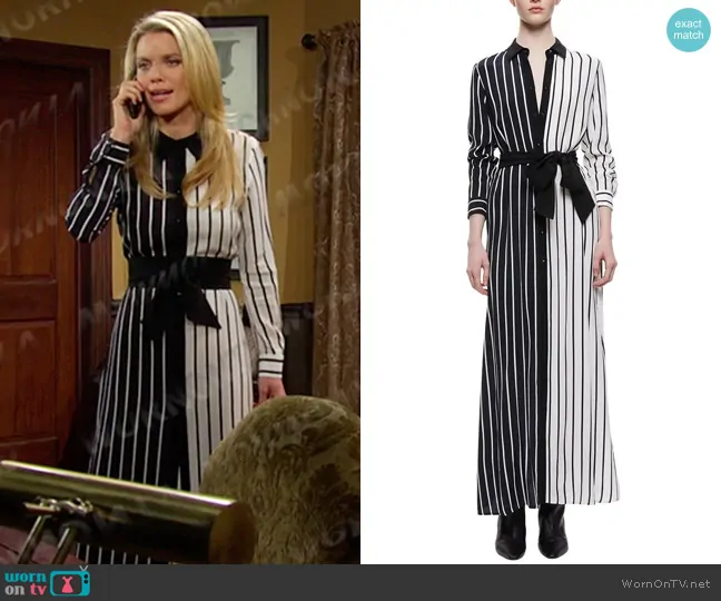 Catherina Greene (played by AnnaLynne McCord) on Days of our Lives on Peacock was spotted wearing this black and white striped shirtdress on Days of our Lives on Oct 18 2024's episode. Cat's Dress is the Chassidy Maxi Shirtdress in vertical palazzo stripe black by Alice + Olivia.