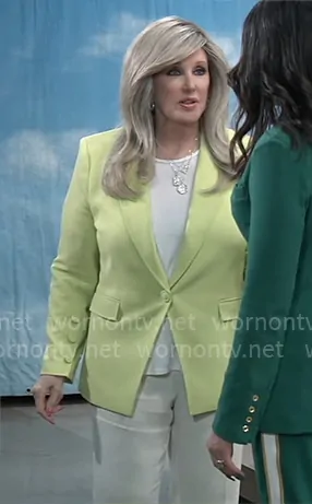Haven (played by Morgan Fairchild) on General Hospital on ABC was spotted wearing this lime green blazer on General Hospital on Aug 23 2024's episode. 's Jacket is the One-Button Blazer in Lime by Tahari ASL .