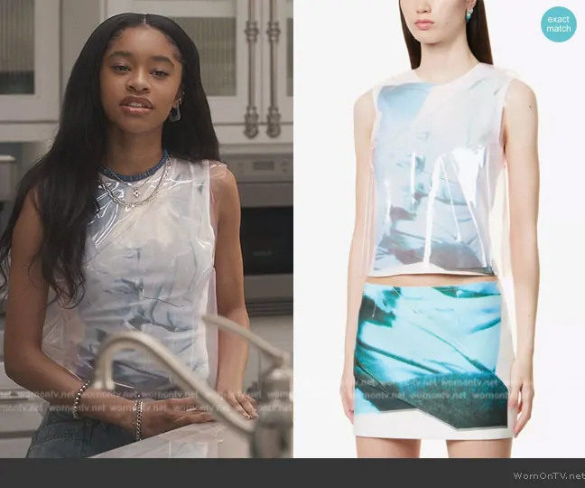 Ashley Banks (played by Akira Akbar) on Bel-Air on Peacock was spotted wearing this blue abstract print top on Bel-Air on episode 'Getting Personal' (3x05) in Aug 2024. Ashley's Top is the Tarano Trompe L'oeil stretch-woven top by 16 Arlington.