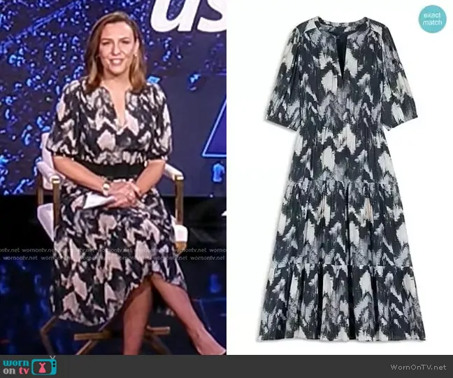 Mary Bruce on Good Morning America on ABC was spotted wearing this abstract print dress on Good Morning America on Aug 26 2024's episode. Mary's Dress is the Anissa Cotton Printed Midi Dress by Ba&Sh.