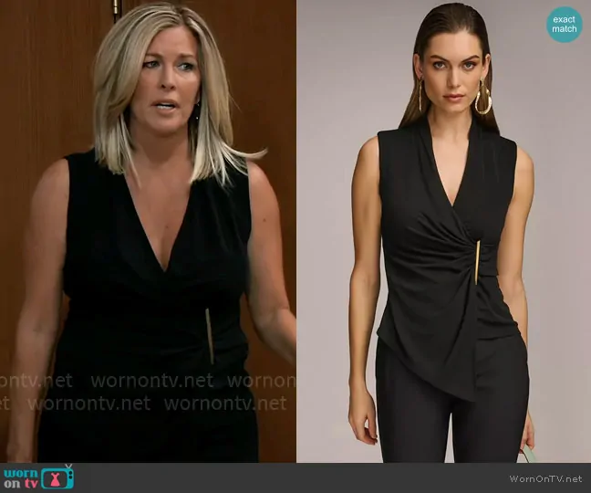 Carly Spencer (played by Laura Wright) on General Hospital on ABC was spotted wearing this black sleeveless wrap top on General Hospital on Aug 26 2024's episode. Carly's Top is the Sleeveless V-Neck Top by Donna Karan .