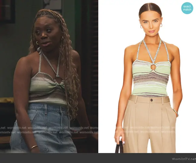 Yolanda Porter (played by Akilah A. Walker) on Bel-Air on Peacock was spotted wearing this green stripe halter top on Bel-Air on episode 'Baggage' (3x06) in Aug 2024. 's Top is the Velza Knit Top by Veronica Beard.