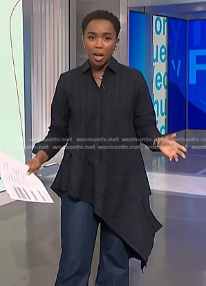 Zinhle Essamuah on NBC News Daily on NBC was spotted wearing this black asymmetric tunic on NBC News Daily on Aug 26 2024's episode. Zinhle's Top is the Divide Asymmetric Fil Coupé Cotton Shirt by Palmer Harding.