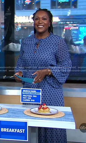 on Good Morning America on ABC was spotted wearing this blue geometric print dress on Good Morning America on Aug 27 2024's episode. 's Dress is the Amata Maxi Dress by Misa Los Angeles.