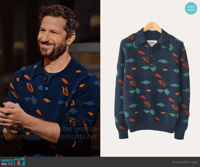 Andy Samberg on Hart to Heart on Peacock was spotted wearing this blue leaf print polo sweater on Hart to Heart on episode 'Andy Samberg' (4x04) in Jul 2024. 's Sweater is the Fall Foliage Polo by Corridor.
