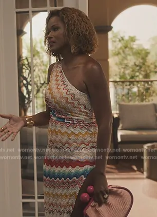 Vivian Banks (played by Cassandra Freeman) on Bel-Air on Peacock was spotted wearing this zig-zag embroidered crop top and skirt on Bel-Air on Aug 29 2024's episode. Viv's Top is the One Shoulder Crop Top by Missoni . Viv's Skirt is the Zigzag-woven draped skirt by Missoni . Viv's Bag is the Medium Raffia-Look Pasticcino Bag by Weekend Max Mara.