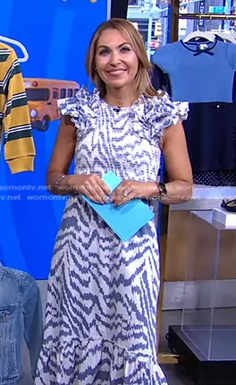 Lori Bergamotto on Good Morning America on ABC was spotted wearing this white and blue animal print dress on Good Morning America on Aug 29 2024's episode. Lori's Dress is the Pilar Dress by Saylor.