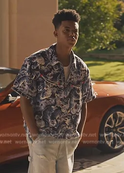 Will Smith (played by Jabari Banks) on Bel-Air on Peacock was spotted wearing this blue floral print shirt and denim shorts on Bel-Air on Aug 29 2024's episode. Will's Shirt is the Big Cat Short Sleeve Western Shirt by Brain Dead . Will's Shorts is the x Levi's® 501 distressed denim shorts by ERL.