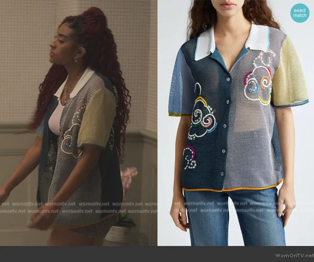 Amira (played by Pascual-Peña) on Bel-Air on Peacock was spotted wearing this embroidered shirt on Bel-Air on Aug 29 2024's episode. Lisa's Shirt is the Netty Cloud Colorblock Organic Cotton Blend Button-Up Shirt by YanYan.