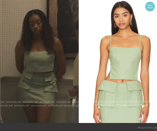 Lisa (played by Simone Joy Jones) on Bel-Air on Peacock was spotted wearing this green crop top and skirt on Bel-Air on Aug 29 2024's episode. Lisa's Top is the Rousseau Top by Camila Coelho . Lisa's Skirt is the Rousseau Midi Skirt by Camila Coelho.