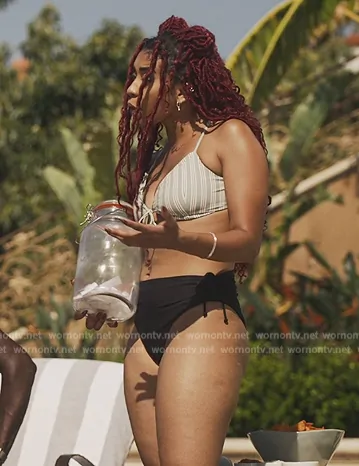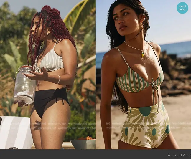Amiri (played by Pascual-Peña) on Bel-Air on Peacock was spotted wearing this green stripe bikini on Bel-Air on episode 'Black Lotus' (3x07) in Aug 2024. 's Bikini Top is the Myrtle Pinstripe Tie Bikini Top by Zulu & Zephyr at Free People.