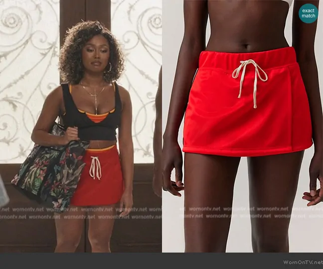 Jackie (played by Jazlyn Martin) on Bel-Air on Peacock was spotted wearing this red mini skort on Bel-Air on episode 'Black Lotus' (3x07) in Aug 2024. 's Skort is the Izzy Track Micro Mini Skort by BDG.