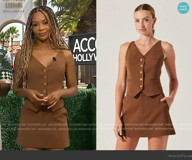 Zuri Hall on Access Hollywood on NBC was spotted wearing this brown vest and mini skirt on Access Hollywood on Aug 30 2024's episode. Zuri's Vest is the Tailored Button Up V-neck Vest by ASTR the Label . Zuri's Skirt is the A-Line Miniskirt by ASTR the Label.