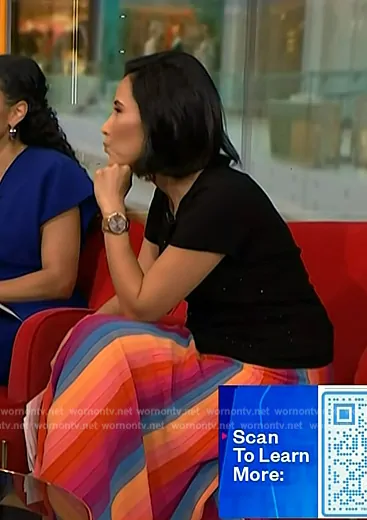Vicky Nguyen on NBC News Daily on NBC was spotted wearing this rainbow stripe skirt on NBC News Daily on Aug 30 2024's episode. Vicky's Skirt is the Rainbow Knit Midi Skirt by Banana Republic.