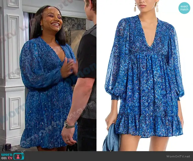 Chanel Dupree (played by Raven Bowens) on Days of our Lives on Peacock was spotted wearing this blue printed long sleeve dress on Days of our Lives on Sep 02 2024's episode. Chanel's Dress is the Smocked Long Sleeve Dress by Aqua.