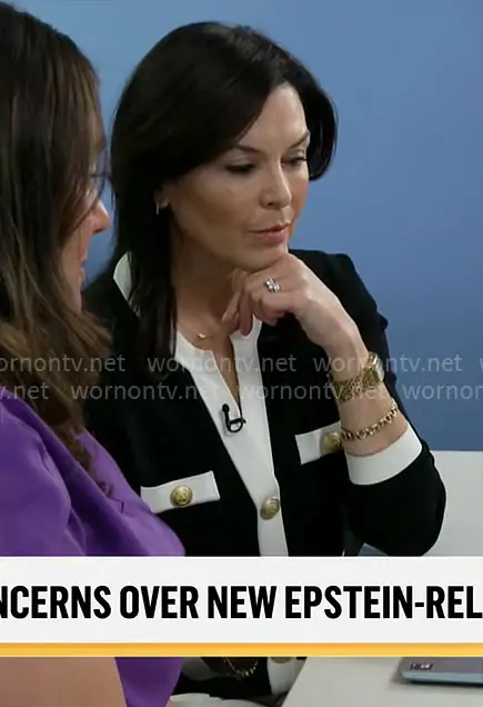 Meg Oliver on CBS Mornings on CBS was spotted wearing this black and white cardigan with gold buttons on CBS Mornings on Apr 04 2026's episode. Meg's Sweater is the Estefania Cardigan by L'Agence .