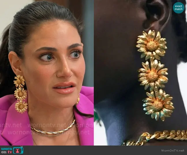 Chloe Tucker Caine on Owning Manhattan on Netflix was spotted wearing this pink blazer and gold sunflower earrings on Owning Manhattan on episode 'Swimming with Sharks' (1x05) in Aug 2024. Chloe's Earrings is the Gold Triple Flower Drop Earrings by Zara.