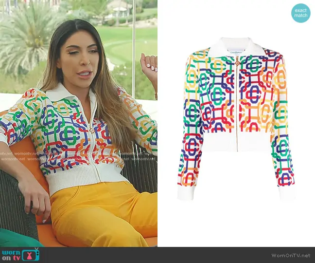 Taleen Marie (played by Taleen Marie) on The Real Housewives of Dubai on BravoTV was spotted wearing this monogram knit zip jacket and yellow pants on The Real Housewives of Dubai on episode 'Best Friends for Never' (2x13) in Sep 2024. Taleen's Sweater is the Monogram Zip-up Cardigan by Casablanca . Taleen's Pants is the Western Pocket Flare Trousers by Casablanca.