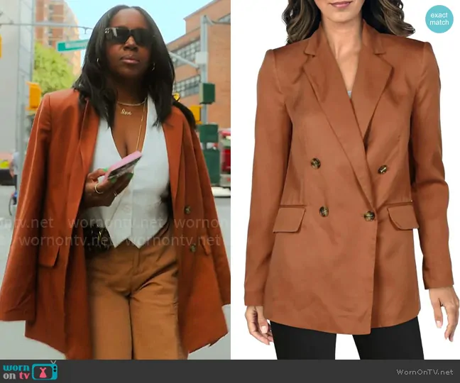 Tricia Lee Riley on Owning Manhattan on Netflix was spotted wearing this rust blazer and cargo pants on Owning Manhattan on episode 'Crazy Promise' (1x06) in Aug 2024. Tricia's Jacket is the Boyfriend Double-Breasted Blazer by DKNY.