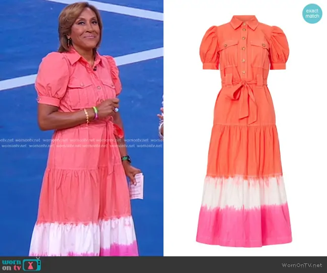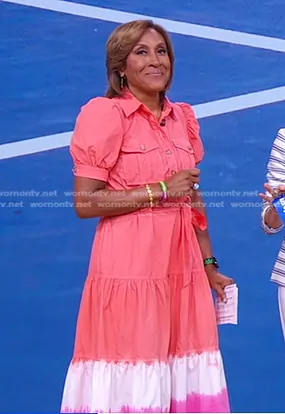 Robin Roberts on Good Morning America on ABC was spotted wearing this pink dip dye puff sleeve dress on Good Morning America on Jan 28 2025's episode. Robin's Dress is the Dip Dye Midi Dress in Pink by Derek Lam Collective.
