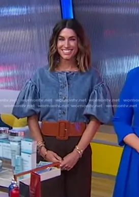 on Good Morning America on ABC was spotted wearing this puff sleeve denim top on Good Morning America on Sep 05 2024's episode. 's Top is the Puff Short Sleeve Denim Top in Medium Wash by Future Collective.