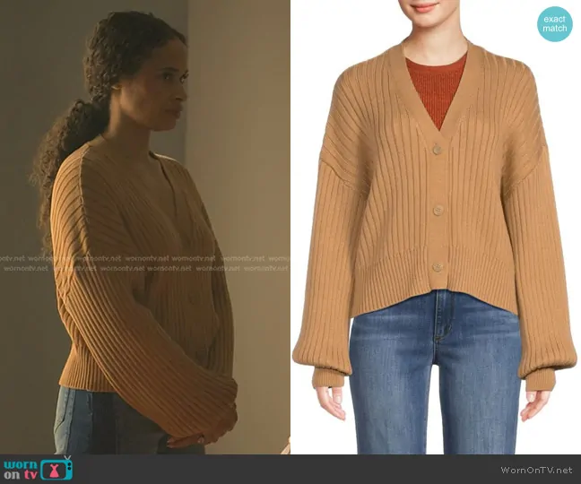 Shanelle Tucker (played by Shannon Kane) on Reasonable Doubt on Hulu was spotted wearing this beige ribbed cardigan on Reasonable Doubt on episode 'Primetime' (2x04) in Sep 2024. Shanelle's Sweater is the Eloise Ribbed Knit Cardigan in Camel by Staud.