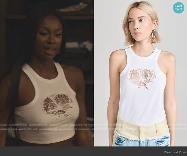 Hilary Banks (played by Coco Jones) on Bel-Air on Peacock was spotted wearing this white crochet knit tank on Bel-Air on episode 'Family Matters' (3x09) in Sep 2024. Hilary's Top is the Crochet Cutout Tank Top by Stella McCartney.