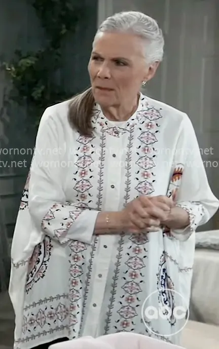 Tracy Quartermaine (played by Jane Elliot) on General Hospital on ABC was spotted wearing this white printed oversized blouse on General Hospital on Apr 17 2026's episode. Tracy's Top is the Katia Embroidered Silk-Blend Oversized Blouse by Johnny Was .