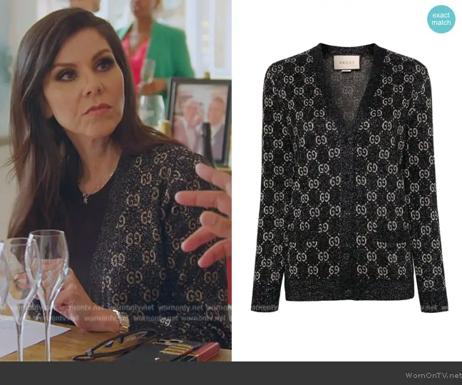 Heather Dubrow on The Real Housewives of Orange County on Bravo was spotted wearing this black GG logo cardigan on The Real Housewives of Orange County on episode 'A Picture Worth a Thousand Words' (18x09) in Sep 2024. Heather's Sweater is the GG jacquard-motif cardigan by Gucci.